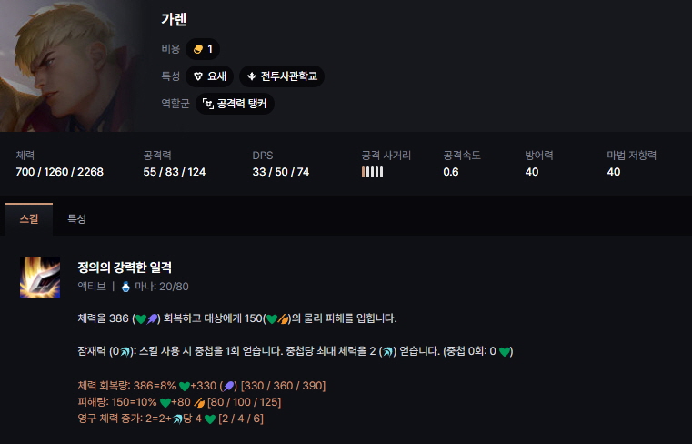 - 스킬을 사용할 때마다 최대 체력을 영구 획득하게 되므로 롤토체스 운동장의 정의 가렌은 전투사관학교 7시너지를 빨리 맞출수록 가렌이 훨씬 더 강해지게 됩니다.