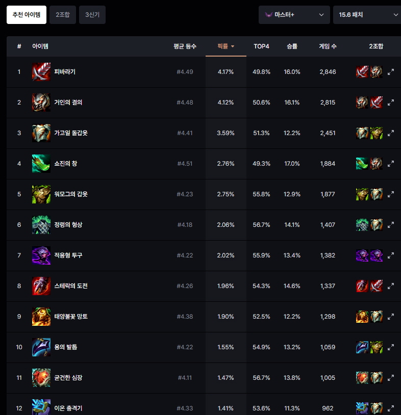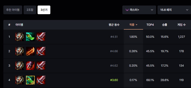 - 위의 아이템을 가장 많이 가며 생존력과 딜을 동시에 챙길 수 있는 아이템 조합이 중요