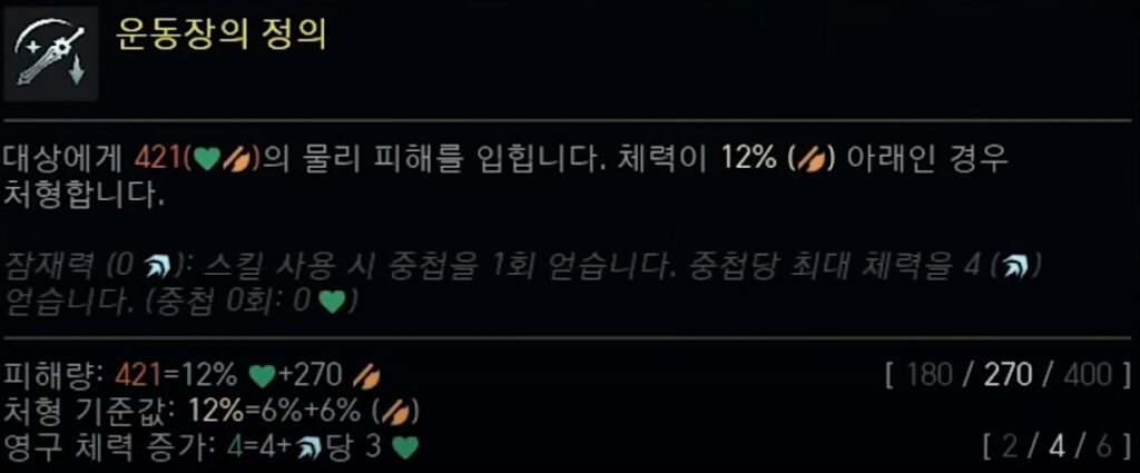 - 스킬: Q 스킬을 기반으로 하며, 다음 공격에 추가 물리 피해를 입히고 최대 체력이 증가합니다.