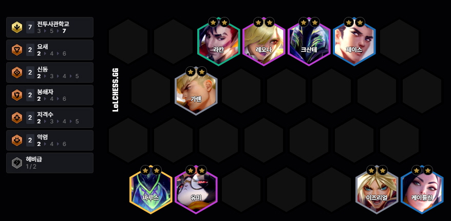 - 가장 중요한 것은 가렌 3성!!! 50골드 리롤을 통해서 3성을 찍어준 후 7전투사관학교를 빠르게 맞춰주기