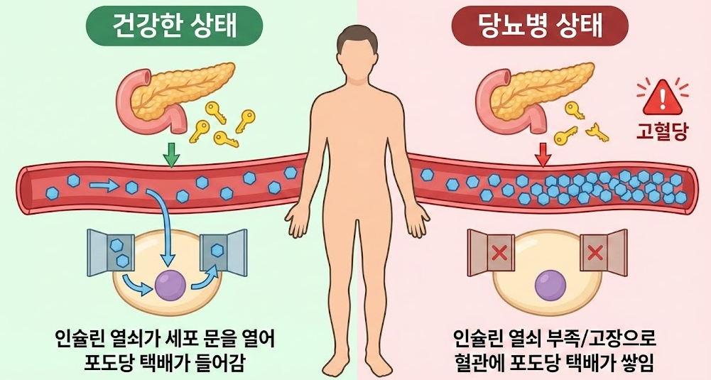 정상적인 몸은 택배(포도당)가 도착하면, 인슐린이라는 ‘현관 열쇠’가 문을 열어 택배를 집 안(세포)으로 쏙쏙 넣어줍니다. 세포는 이 에너지를 써서 활동합니다. 당뇨병이란 현관 열쇠(인슐린)가 고장 났거나(2형 당뇨), 열쇠가 아예 없는(1형 당뇨) 상태입니다. 결과적으로는 택배가 집 안으로 못 들어가고 집 앞 복도(혈관)에만 가득 쌓입니다. 이렇게 혈관에 당분이 넘쳐나는 상태가 바로 ‘당뇨’입니다.