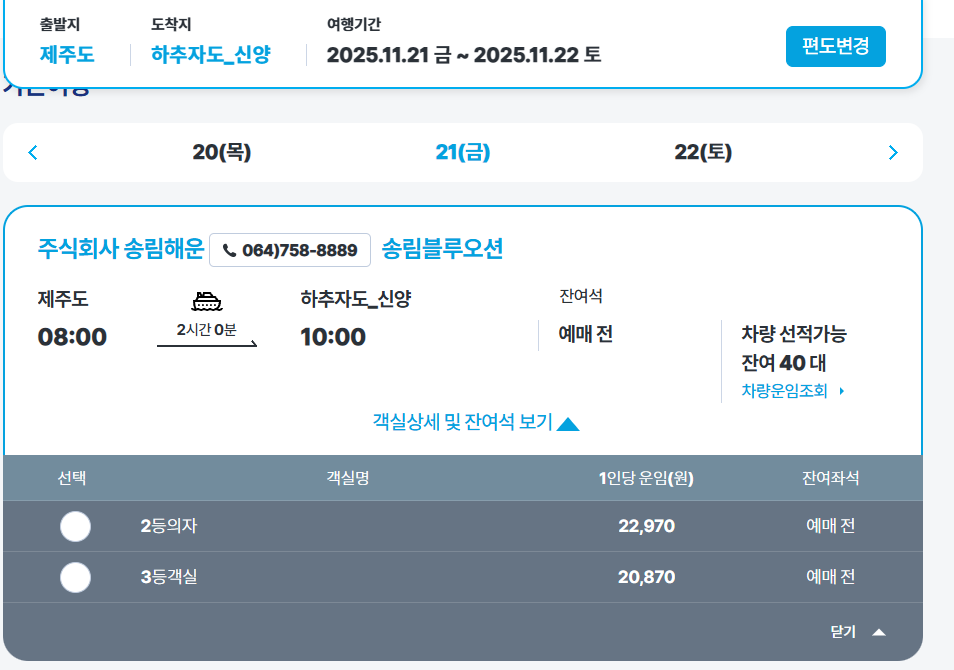 - 제주 → 하추자: 20,870원 ~ 22,970원
