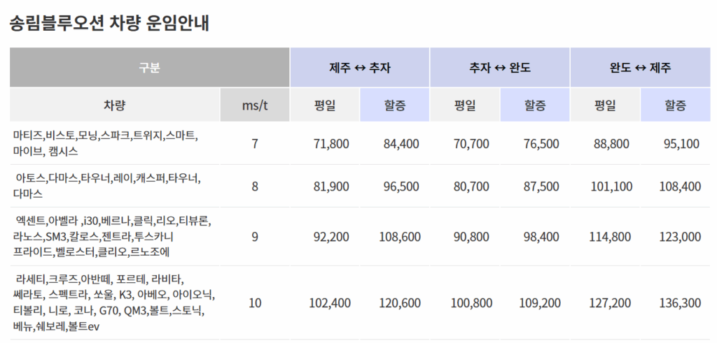 송림블루오션 차량 선적 요금은 차량 크기와 구간(제주 ↔ 추자 ↔ 완도)에 따라 달라지며, 일반 승용차 기준으로 약 70,000원대부터 시작합니다.