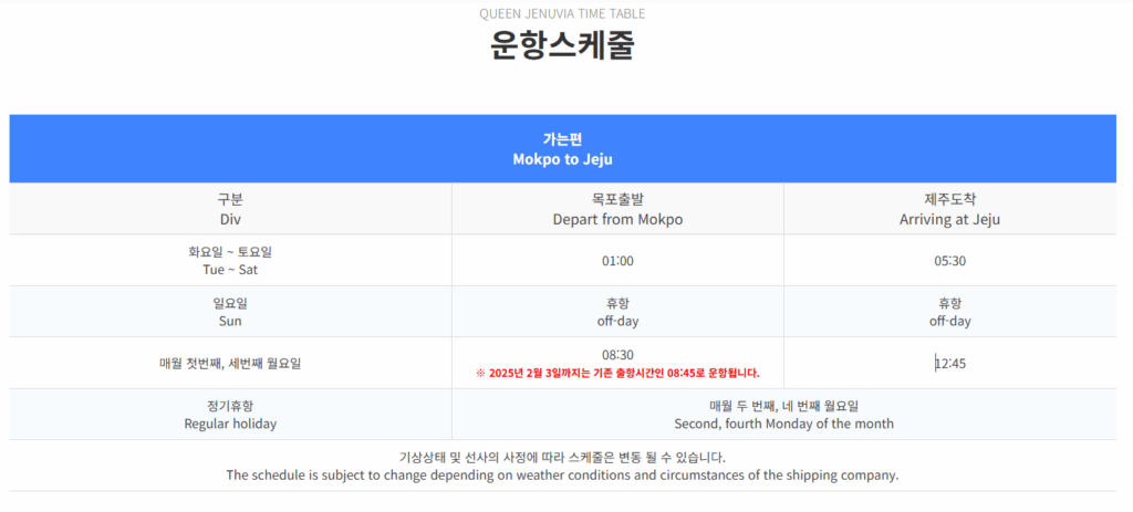 ※ 스케줄은 날씨나 운항 상황에 따라 변동될 수 있으니, 씨월드고속훼리 공식 홈페이지에서 확인하는 게 좋아요.