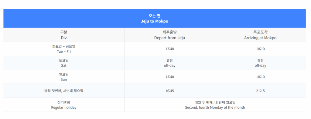 출항 시간 | 목포→제주: 01:00<br>제주→목포: 13:40 | 목포→제주: 08:30<br>제주→목포: 16:45 (요일별 상이) |