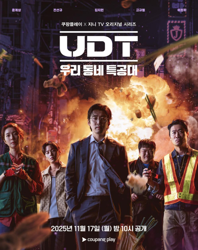 ‘UDT: 우리 동네 특공대’는 2025년 11월 17일 첫 방송된 ENA 월화 드라마로, 쿠팡플레이와 지니TV에서 동시에 공개되는 액션 코미디 시리즈입니다. 윤계상·진선규·고규필·김지현·이정하 등이 주연을 맡아 예비역 특공대원들이 가족과 동네를 지키기 위해 다시 뭉치는 이야기를 그립니다.